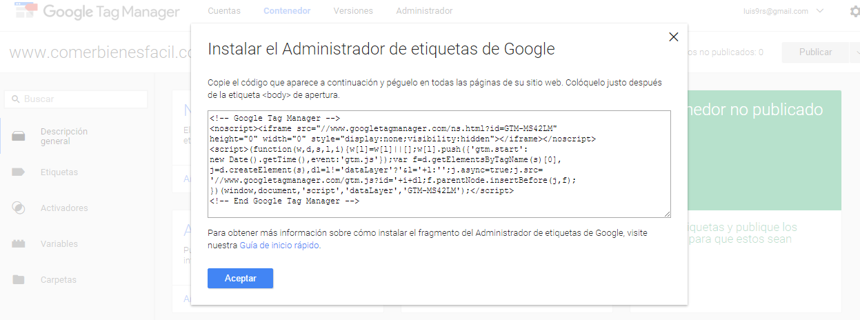 ¡Listo! Ya lo tendremos “instalado”. La ventaja es que, una vez insertado este, nos olvidaremos de insertar más código. Porque de la programación en tu web se encargará Google Tag Manager. ¿Cómo? De manera remota 🙂