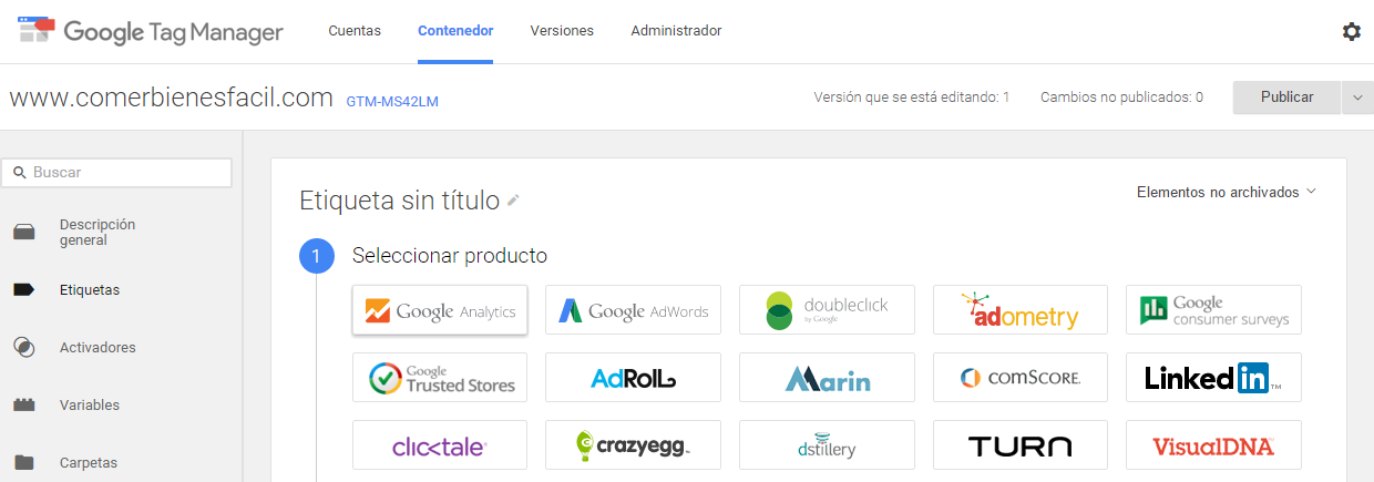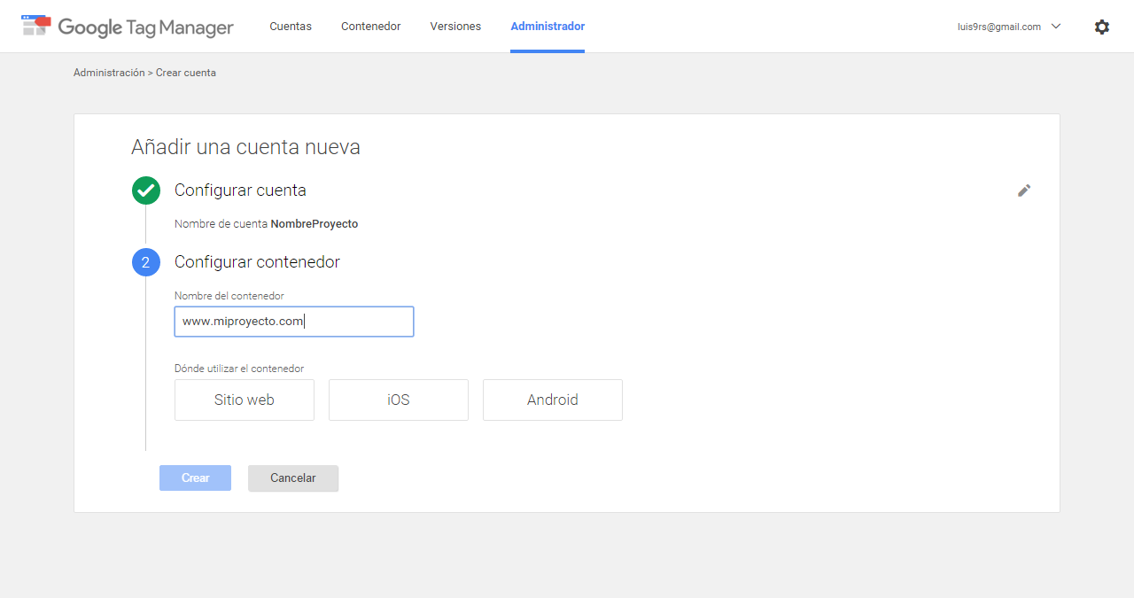 Asignas un nombre a la cuenta (proyecto concreto sobre el que vamos a trabajar) y en «Nombre del contenedor» puedes poner el mismo nombre o bien el propio nombre de dominio. Este «contenedor» es el que va a contener, valga la redundancia, todas las etiquetas de código que queramos crear en nuestro sitio web, a partir de ahora con una interfaz amigable.