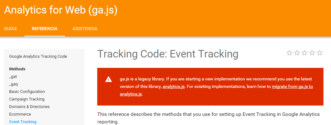 «ga.js» es una biblioteca obsoleta. Si tú estás empezando una nueva implementación, te recomendamos que uses la nueva versión de esta biblioteca, analytics.js. Para implementaciones existentes, aprende como migrar de ga.js a analytics.js